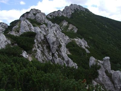 La montagne de calcaire et de dolomite atteint une altitude de 1805 mètres, présentant de nombreuses formations rocheuses et tours appelées Rochers en Rangée.