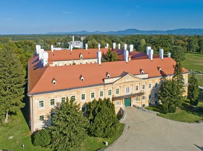 Le parc qui entoure le manoir contient des arbres anciens et un tilleul conserve qui date de l'allee d'arbres originale. Un puits restaure avec l'embleme de la famille Pálffy montre le soin apporte pour maintenir meme les petits details historiques.
