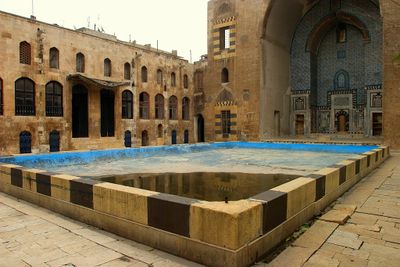 Le Palais Junblatt présente une architecture syrienne traditionnelle avec une cour centrale, une fontaine et deux étages intégrant des motifs de maçonnerie détaillés.