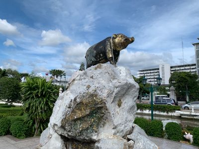 Le monument affiche une figure de porc noir qui parle aux personnes nées dans l'Année du Porc selon le calendrier thaï traditionnel. Les visiteurs observent un symbole chargé de sens personnel pour de nombreux habitants et qui reflète leur connexion à la tradition astrologique.
