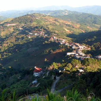Santikhiri est un village de montagne situé à environ 1.200 mètres d'altitude, entouré de plantations de thé sur des pentes en terrasses. L'établissement s'étend sur des collines escarpées avec des zones cultivées aménagées qui façonnent le paysage local.