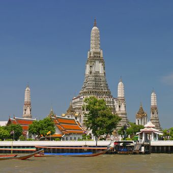 Wat Arun est un temple bouddhiste sur la rive ouest du Chao Phraya dans Bangkok Yai, reconnaissable de loin par sa tour centrale de 82 mètres. Cette tour et quatre tours d'angle plus petites sont décorées de fragments de porcelaine chinoise et de carreaux de céramique colorés formant des motifs géométriques et floraux.
