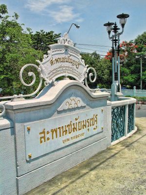 Le Pont Chamai Maru Chet traverse le canal Khlong Prem Prachakon le long de Phitsanulok Road avec quatre voies de circulation dans chaque direction. Des passerelles piétonnes surélevées courent de chaque côté, permettant un passage sûr sur la voie navigable.