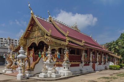Wat Ming Mueang est un temple bouddhiste situé à Wiang qui présente l'architecture Lanna typique du nord de la Thaïlande. Les bâtiments affichent plusieurs toits en étages, des sculptures sur bois détaillées et des motifs décorés dans toutes les zones.