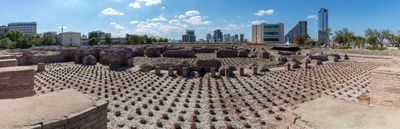 Le complexe présente 32 colonnes sur chaque côté de la palestre et préserve de nombreuses structures pilae du système de chauffage initial.