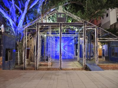 Le parc présente une installation artistique nocturne en 3D projetant des lignes blanches sur des murs bleus.