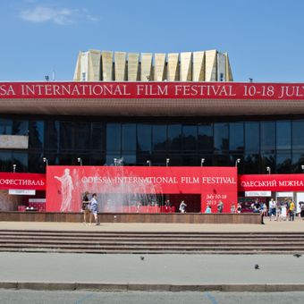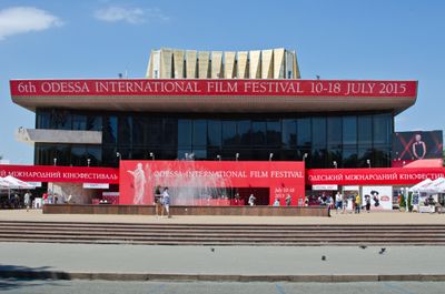 Le théâtre constitue un lieu central des arts du spectacle à Odessa, présentant une façade qui illustre les éléments architecturaux soviétiques du milieu du XXe siècle.