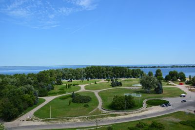 Rose Valley est un espace vert protégé le long du Dnieper a Cherkasy avec des lacs artificiels, des fontaines et des sentiers sinueux traversant le terrain. Des arbustes tailles et de petits arbres creent des sections distinctes, tandis que des arbres plus grands bordent la rive du fleuve.