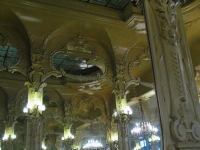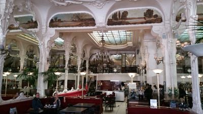 Les murs intérieurs contiennent des miroirs du sol au plafond créant des reflets infinis, tandis que la section café présente une fresque représentant la légende de Gambrinus.