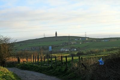La tour circulaire en pierre de Hartshead Pike atteint 12 mètres de hauteur à une altitude de 267 mètres, offrant des vues sur Manchester et la vallée Medlock.