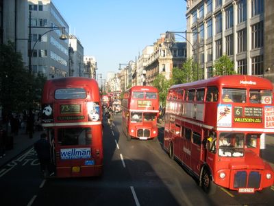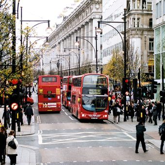 Oxford Street est une artère commerçante du West End de Londres qui s'étend sur 2,4 kilomètres entre Tottenham Court Road et Marble Arch, abritant plus de 300 boutiques. Le tracé suit une ligne droite vers l'ouest, avec des grands magasins et des enseignes de chaque côté et des carrefours marqués par des stations de métro.