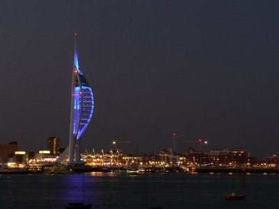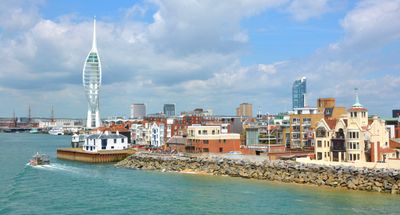 Portsmouth est une ville portuaire du Hampshire sur la côte sud de l'Angleterre, située principalement sur l'île de Portsea et bordée par les eaux du Solent et du bassin portuaire. Le paysage urbain combine des chantiers navals et des expositions de navires historiques avec des quartiers résidentiels, des parcs et un centre commercial moderne, tandis que le front de mer offre des vues sur le trafic constant de ferries entre continent et île.