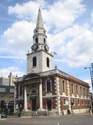 St George the Martyr est une eglise anglicane construite en brique rouge avec des details en pierre de Portland et une fleche distinctive couronnee par une girouette dans le quartier de Borough. L'interieur est divise par des colonnes ioniques qui soutiennent les galeries superieures.