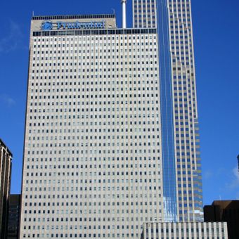 One Prudential Plaza atteint 183 mètres de hauteur avec 41 étages, présentant des façades en verre et des silhouettes linéaires caractéristiques.