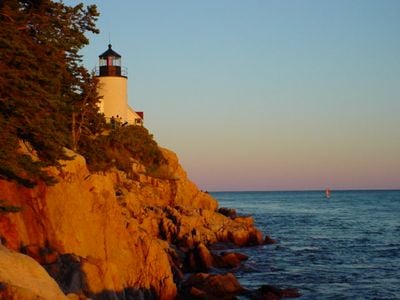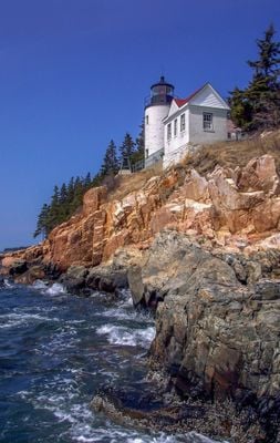 Le phare de Bass Harbor se dresse sur des falaises rocheuses à la pointe sud de l'île des Monts Déserts, signalant l'entrée du port.