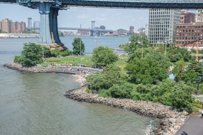 Brooklyn Bridge Park est un espace vert en bord d'eau qui s'étend le long de la rive de l'East River et relie plusieurs quais réaménagés par des chemins et des pelouses. La zone comprend des terrains de sport des aires de jeux et des prairies ouvertes qui offrent des vues sur les tours de l'autre côté de l'eau.