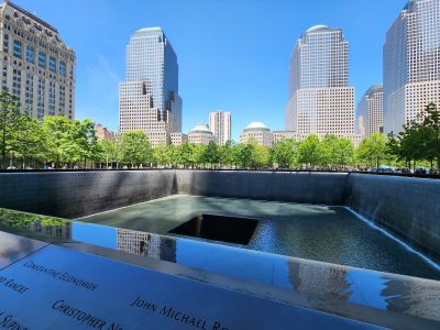 Le National September 11 Memorial & Museum est un mémorial et musée dans le quartier financier de New York. Deux bassins carrés occupent les empreintes où se trouvaient les tours jumelles, entourés de panneaux de bronze gravés des noms des victimes.