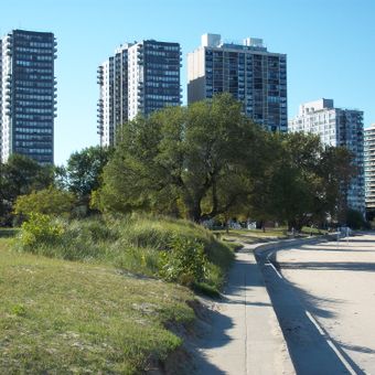 Edgewater est un quartier résidentiel au nord de Chicago qui s'étend de l'avenue Ravenswood jusqu'aux rives du lac Michigan. La zone est bordée d'immeubles d'appartements de différentes hauteurs et offre un accès direct aux plages publiques le long de l'eau.