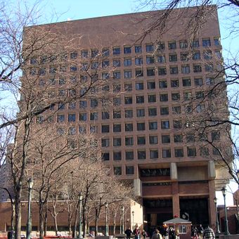 1 Police Plaza est le siège du département de police de New York dans le sud de Manhattan. Le cube de briques rouges de quinze étages repose sur un socle à plusieurs niveaux avec des angles en porte-à-faux, présentant un motif régulier de fenêtres carrées.