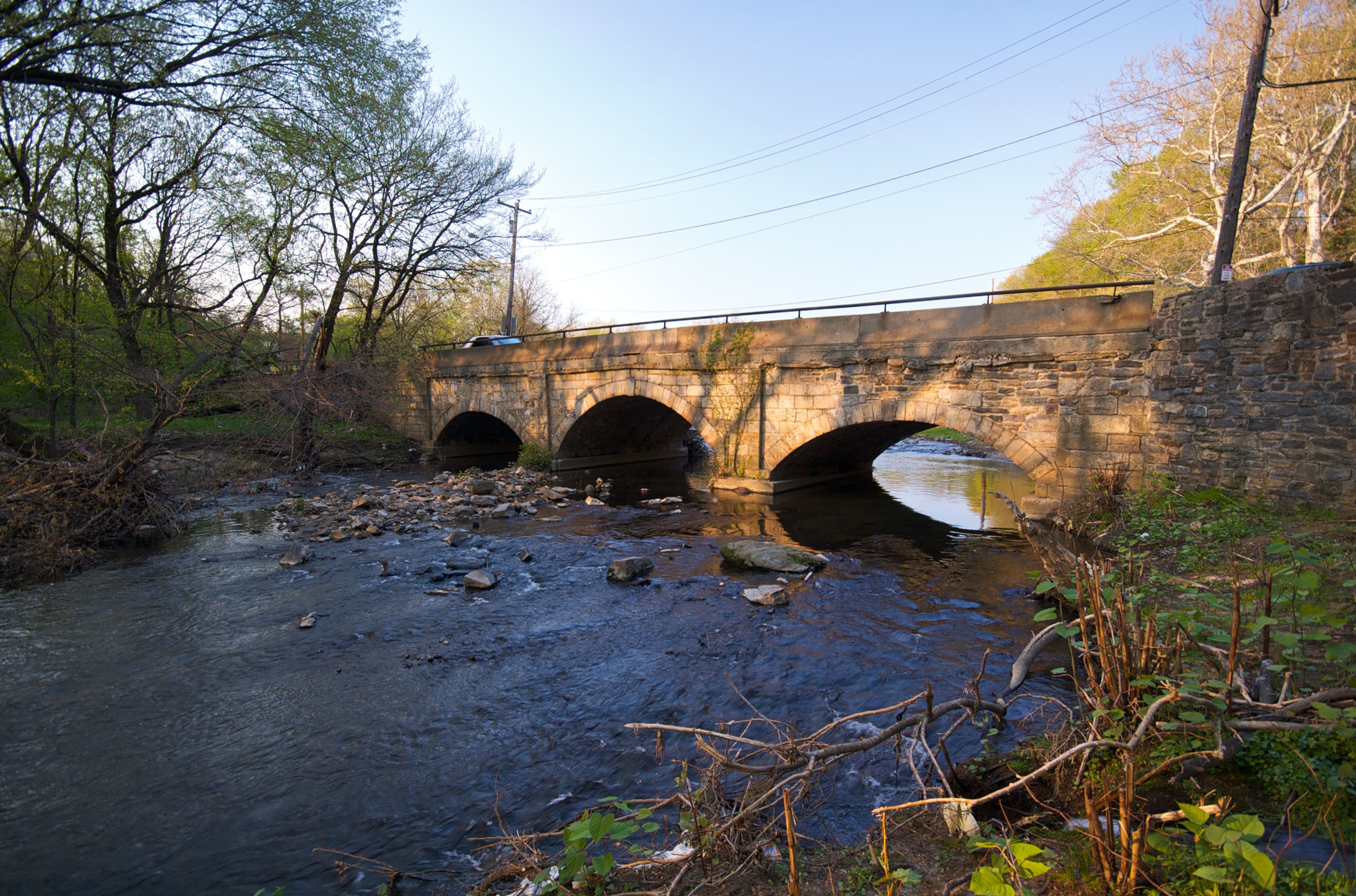 Le pont de l'Avenue Adams présente une conception à triple travée en pierre, traversant le ruisseau Tacony dans l'environnement naturel du parc Tacony Creek.