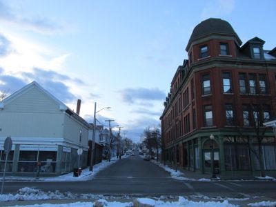 Le bâtiment Union Street Railway Carbarn demeure comme structure remarquable dans ce quartier ouvrier développé pendant l'expansion industrielle de New Bedford.