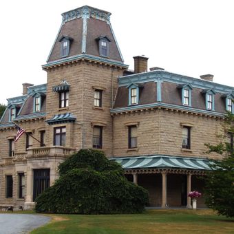 Chateau-sur-Mer est une résidence en granit de trois étages située sur Bellevue Avenue à Newport, Rhode Island, avec de larges balcons et un grand hall s'élevant sur plusieurs niveaux. La propriété comprend des pièces dans différents styles, dont un bureau, une bibliothèque et une salle de billard avec des boiseries détaillées et des sculptures au plafond et sur les murs.