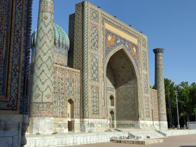 Le Sherdor Madrasah est un bâtiment d'enseignement et musée sur la place Registan avec une façade symétrique présentant deux grands minarets, des dômes nervurés et des mosaïques compliquées sur ses murs extérieurs. La structure sert maintenant de salle d'exposition montrant des objets liés à la culture islamique et au patrimoine éducatif de la région.