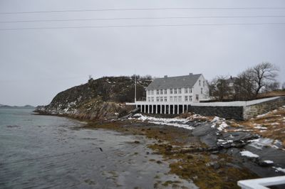Grøtøy handelssted est un bâtiment en bois de 22 pièces situé sur une île près du Vestfjorden face à la mer de Norvège. La structure affiche l'architecture typique d'un grand établissement commercial avec plusieurs niveaux et de nombreux espaces fonctionnels.