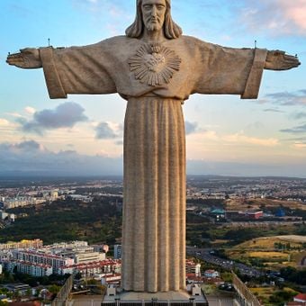 Le Sanctuaire du Christ Roi s'élève sur une colline surplombant le Tage, une figure blanche en béton au sommet d'un portail élevé. Les bras s'étendent au-dessus d'Almada vers la capitale.