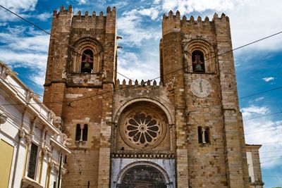 La cathédrale Santa Maria Maior présente deux tours massives de style roman et une façade principale fortifiée surmontée de créneaux défensifs.