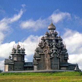 Kizhi Pogost est un ensemble religieux composé de deux églises en bois et d'un clocher sur une île du lac Onega, dans le nord de la Russie. Les bâtiments se dressent ensemble sur un site ouvert surplombant l'eau et font partie d'un musée en plein air consacré à l'architecture historique en bois.