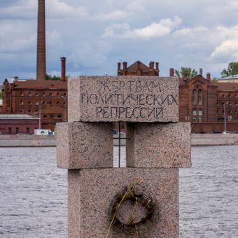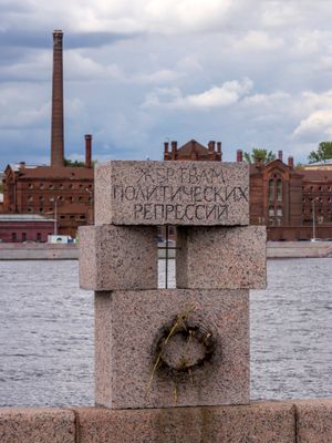 Le Monument aux victimes des répressions politiques se compose de deux sphinx en bronze sur des socles en granit le long de la Neva à Saint-Pétersbourg. Chaque sphinx présente un visage jeune d'un côté et des traits squelettiques de l'autre, contrastant vie et mort.